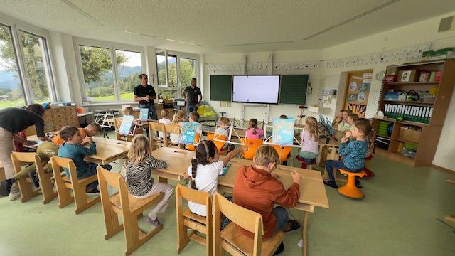 Unsere Schulanfänger sind auf der Straße unterwegs, den Weg zur Schule und wieder nach Hause dürfen sie ab jetzt alleine meistern. Unterstützung gab es in der ersten Schulwoche von den Polizisten Lisa und Lukas, die den Kindern genau erklärten, wie sie am sichersten über den Zebrastreifen kommen: am Straßenrand warten, links-rechts-links schauen und mit hoch erhobenem Arm die Straße überqueren, um sich größer und somit sichtbarer zu machen – waren wohl die wichtigsten Tipps, die sie den Kindern mitgegeben haben.