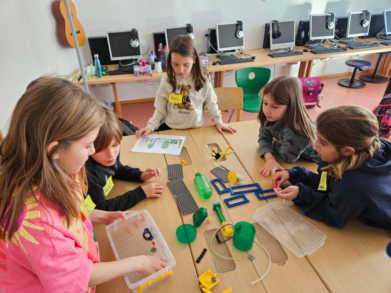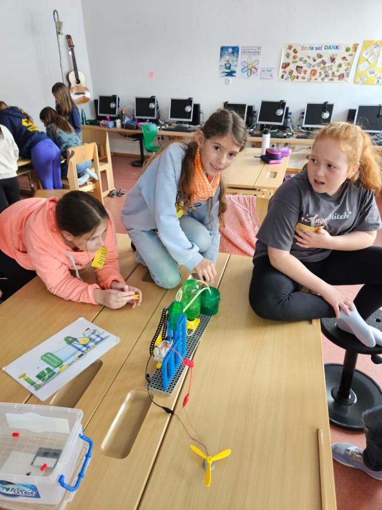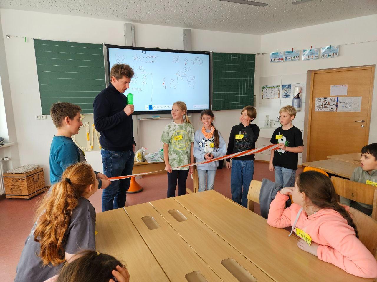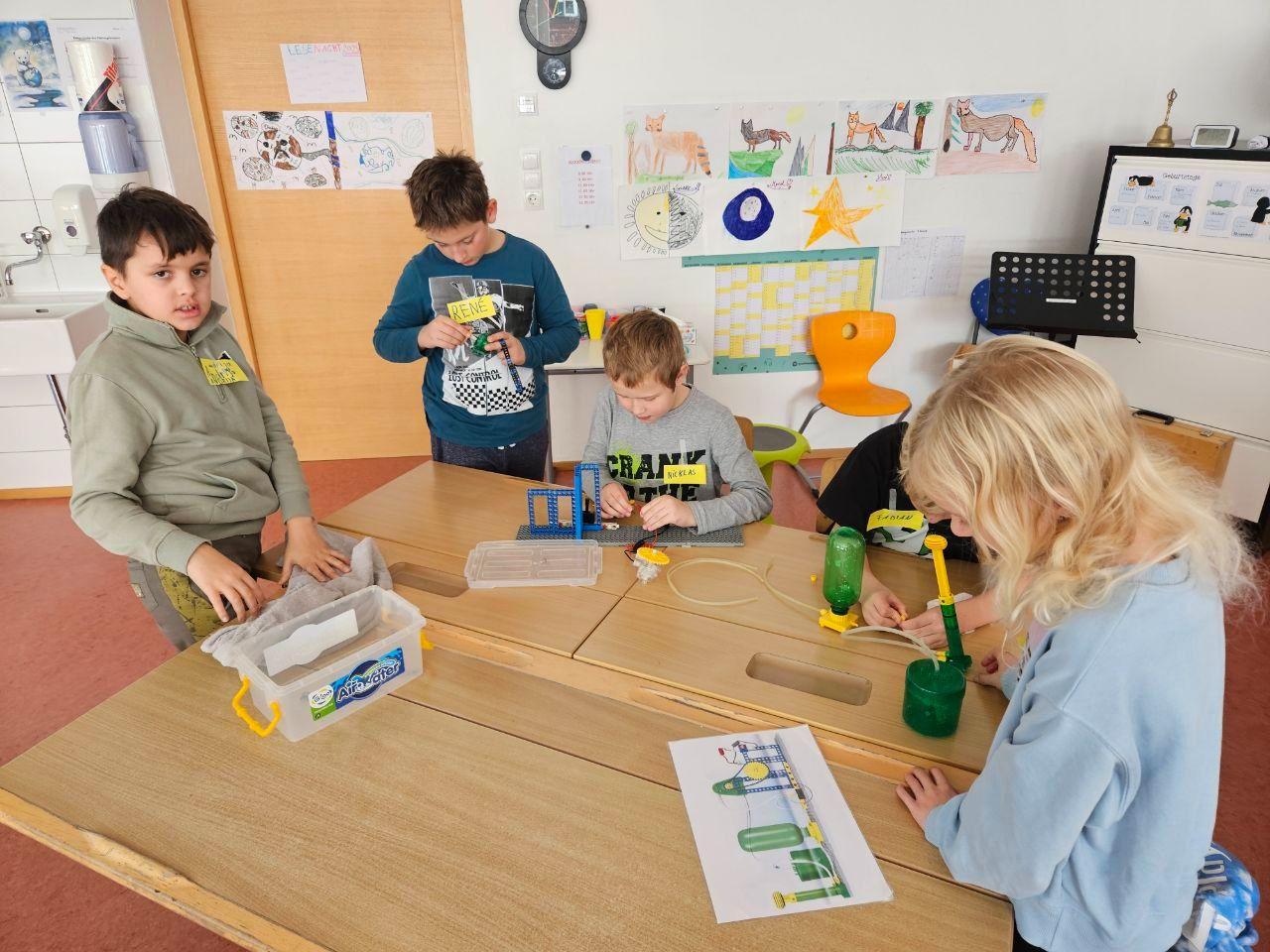 Energieberater Tobias erklärt den Kindern, auf wie immer sehr anschauliche Art und Weise, wieviel Energie wir womit verbrauchen, und vor allem wie wir sie sparen können. Neben einigen theoretischen Inputs geht's dann für die Kinder der dritten und vierten Klasse an einen Pumpkraftwerksbau, das nach kleineren bautechnischen Schwierigkeiten nicht nur in Betrieb genommen, sondern anschließend auch feierlich eröffnet wird.